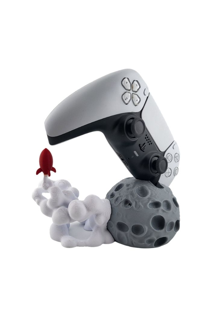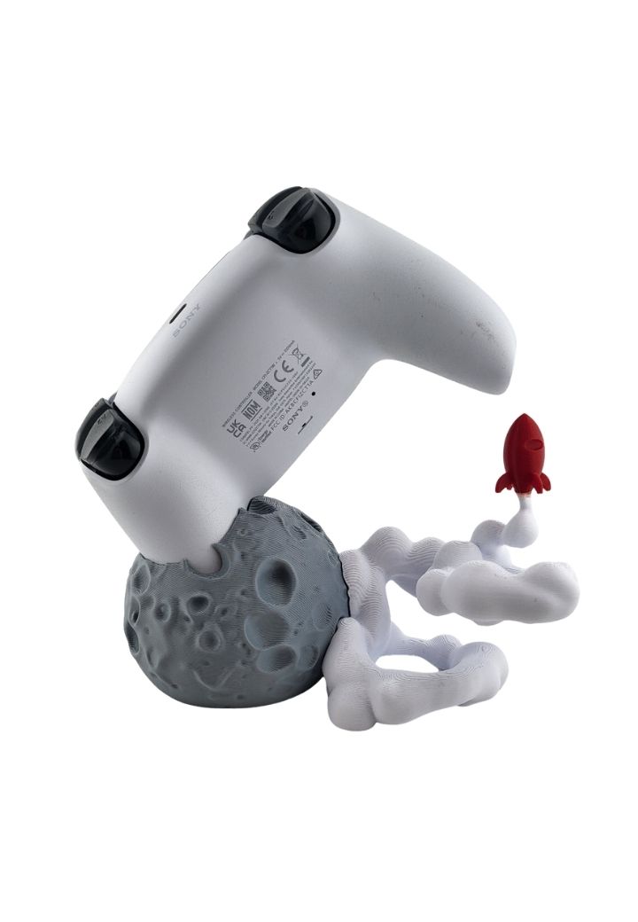 Com uma Lua como base, o suporte dá ao seu controle um lugar especial para repousar. Além disso, o detalhe inspirado em foguete soltando fumaça traz um toque dinâmico e criativo ao produto. Cada elemento foi cuidadosamente elaborado para capturar a beleza do universo e transformar um item cotidiano em uma peça decorativa diferenciada. Impressa em PLA, a construção é durável, sustentável e visualmente impressionante, garantindo que o suporte se destaque em qualquer ambiente.