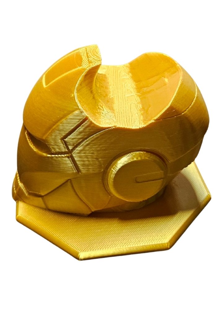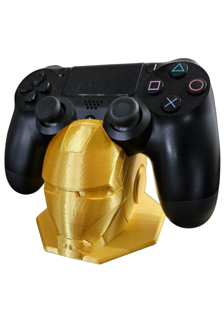 Este suporte foi cuidadosamente projetado e impresso em PLA na cor gold, garantindo durabilidade e elegância. A parte superior da cabeça do Homem de Ferro segura seu controle com firmeza e segurança, evitando quedas e mantendo-o sempre acessível. Sua construção robusta proporciona praticidade enquanto exibe um estilo que chama atenção.